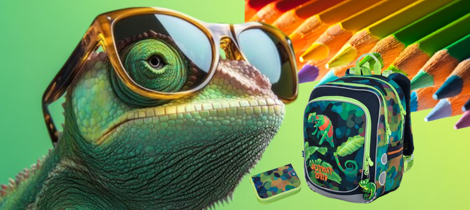 🧢 Set pôsobí ako vizuálny zážitok, kde sa prelínajú odtiene divočiny, rozumu a hravej zvedavosti. V spojení so zábavným fantazijným obrazom chameleóna v slnečných okuliaroch, ktorý sme vytvorili ako hravý doplnok, sa celý koncept mení na príbeh – o chlapcovi, ktorý vďaka farebnému spoločníkovi prechádza každý školský deň ako skúsený dobrodruh, neustále objavujúci nové horizonty.