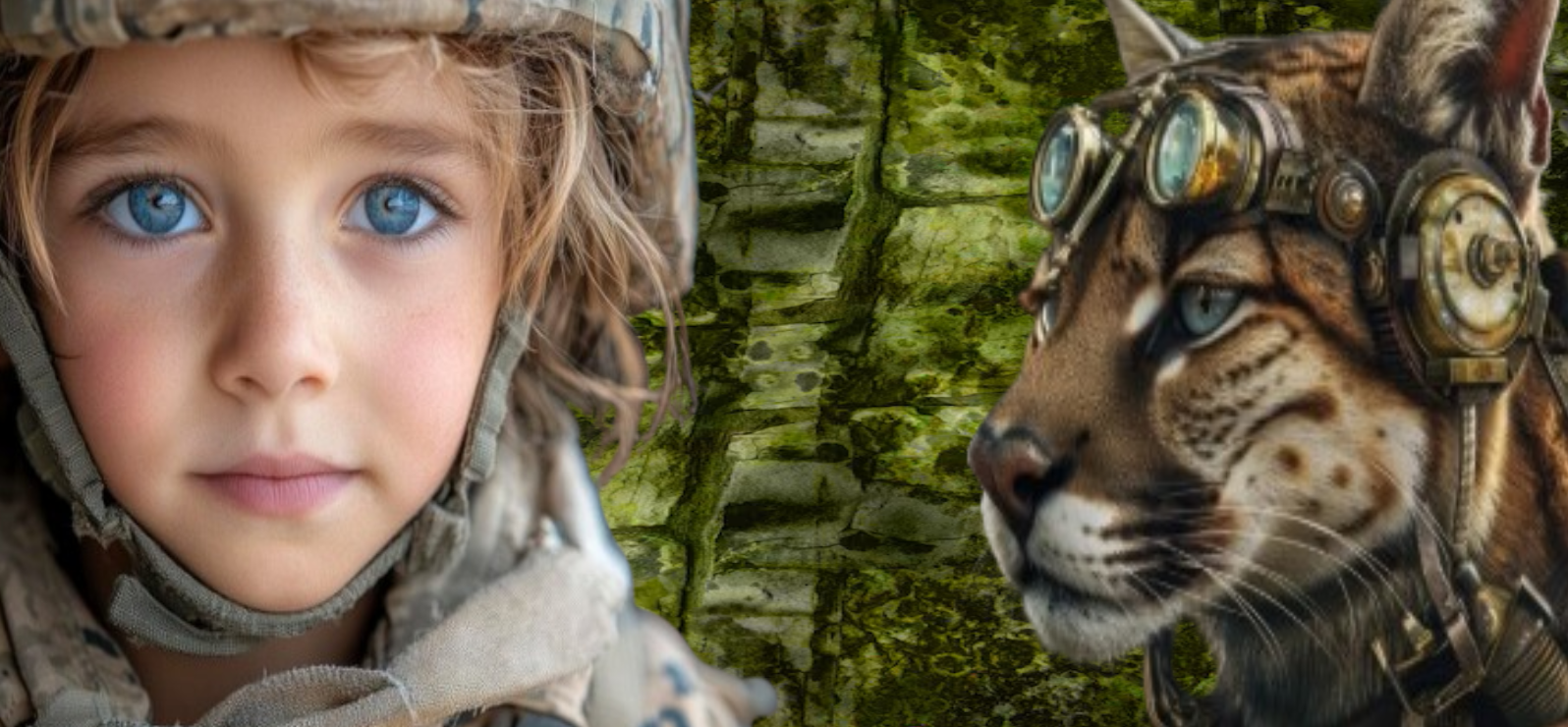 👦 Modré oči malého veliteľa sú ako radar, ktorý zameriava nové vedomosti. Po jeho boku stojí mystický rys – zviera s dušou stratéga, vybavené steampunkovým zariadením, akoby mu samo poznanie šepkalo do ucha. Tento obraz nie je súčasťou batohu, ale fantázie, ktorá k nemu neoddeliteľne patrí. Je to príbeh, ktorý batoh rozpráva každému, kto sa ho dotkne.