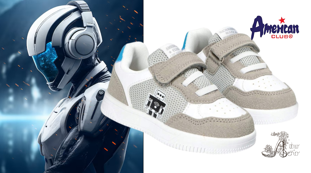 AmericanClub-chlapčenské tenisky–biela v spojení so sivou, tyrkysovou a robotom na vonkajšej strane do sveta dobrodružstva👟💙