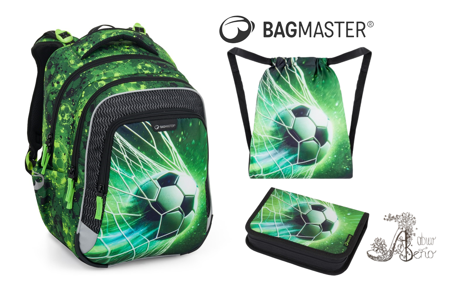 Bagmaster🌟školský set pre malých futbalových hrdinov – batoh, peračník a vrecko v motíve „Zeleň futbalu“ ⚽🌿