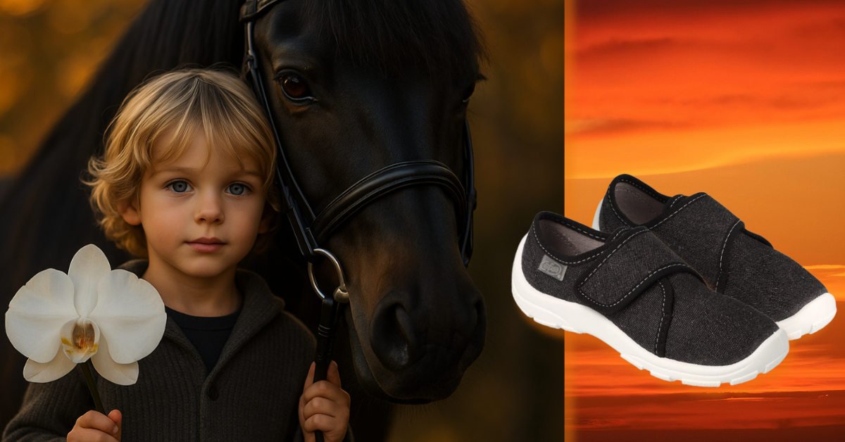 Fotografia, ktorú si zvolila, prináša nádherný príbeh – blonďavý chlapček so zvedavým pohľadom, stojaci pri majestátnom čiernom koni 🐎 a držiaci krehkú bielu orchideu 🌸. Táto scéna je ako metafora pre tieto papučky – spojenie sily a jemnosti, energie a elegancie. Kôň symbolizuje silu a stabilitu, orchidea zase jemnosť a čistotu. Rovnako tak papučky kombinujú odolnosť s jemným dotykom pohodlia.