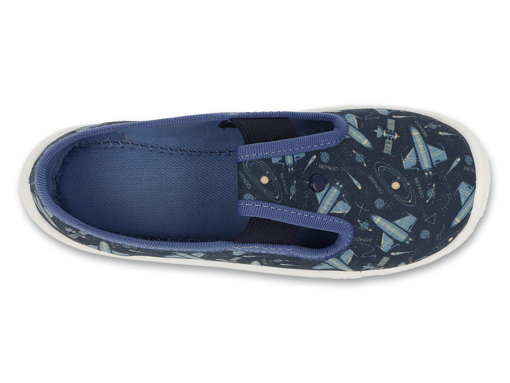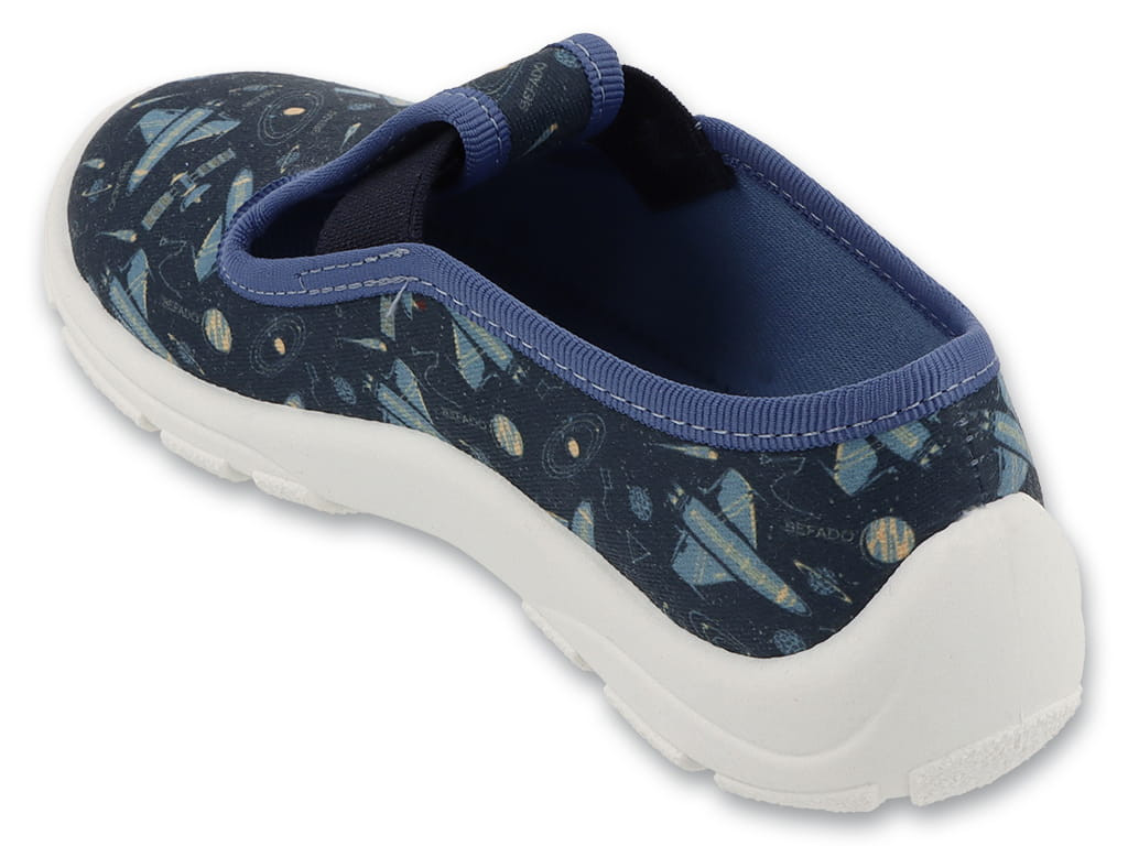 Predstavte si ranné slnko, ktoré sa odráža na kovovom krídle lietadla, pripraveného na vzlet. Tak presne pôsobia tieto papučky – tmavomodré ako obloha pred svitaním, posiate drobnými stíhačkami, ktoré sú pripravené vyštartovať spolu s vaším dieťaťom do školy či škôlky. Nie sú to len prezuvky – sú to malé hangáre snov, v ktorých nožičky nájdu bezpečné útočisko a zároveň odrazový mostík k úspechu.