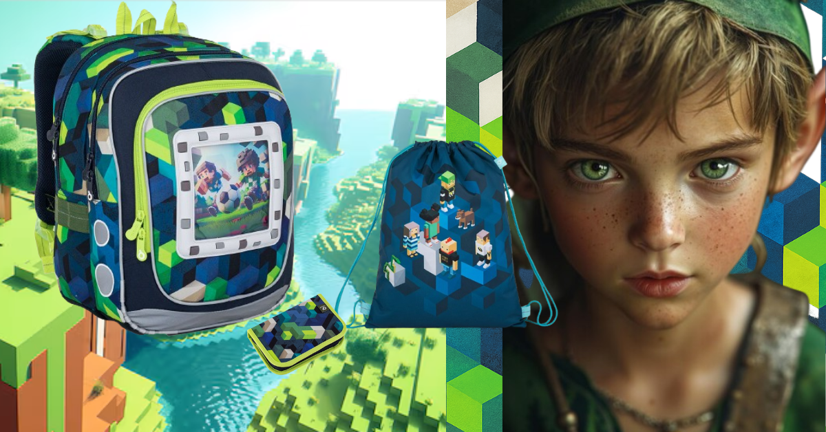 Ako šperk ukrytý v truhlici, aj táto taška nesie štyri obrázky so zvieracími a športovými motívmi v štýle Minecraft – každý obrázok je malou vstupenkou do iného vesmíru fantázie, ktorý dokáže dieťa preniesť do ríše hier a príbehov priamo na školskú chodbu.