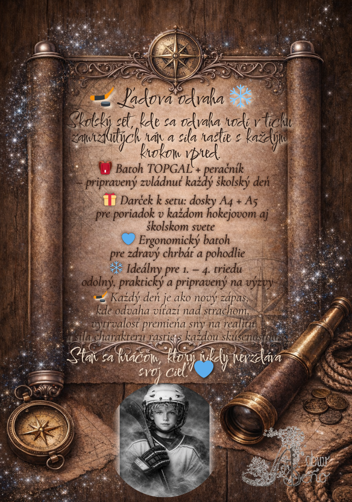 Niektoré školské sety sú praktické. Niektoré sú krásne. A potom sú také, ktoré v sebe nesú príbeh. Tento set je ako tichá energia zimného štadióna, kde sa zrodí odvaha, odhodlanie a radosť z pohybu. Každý zošit, každé pero a každá školská úloha sa tu stáva malým krokom na ľadovej dráhe poznania. Batoh, peračník aj dosky spolu vytvárajú tím, ktorý drží pri sebe – spoľahlivý ako dobre zohraná formácia. Chránia školské poklady, organizujú malé nápady a sprevádzajú mladého školáka na ceste za novými vedomosťami. A tak sa tento set nestáva len školskou výbavou. Stáva sa spoločníkom každodenných víťazstiev – od prvých písmen až po veľké sny, ktoré raz vyrastú z malých krokov. Pretože každé veľké víťazstvo sa začína jedným krokom… a jedným školským dňom. ✨🎒