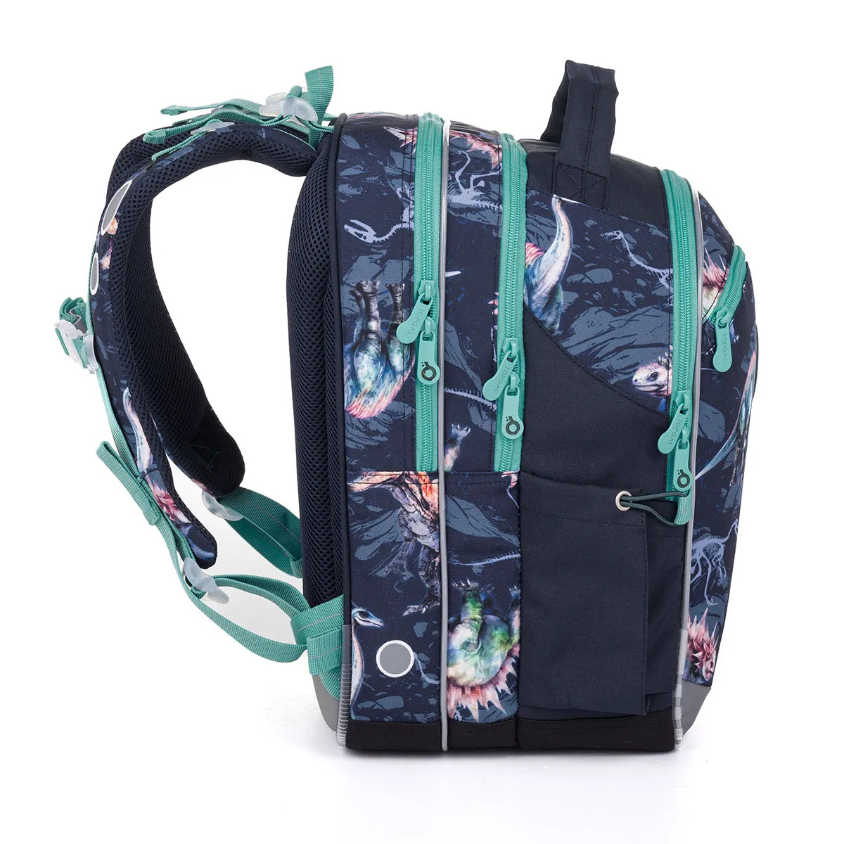 Tmavá trojkomorová školská taška s motívom dinosaurov je ako vstupná brána do sveta pradávnych dobrodružstiev, kde vládla odvaha, sila a nezdolná energia. Je stvorená pre deti s výškou od 120 cm, ktoré milujú objavovanie, fantáziu a príbehy o dávnych tvoroch, ktorí kedysi kráčali po našej planéte. Model COCO patrí medzi najobľúbenejšie strihy medzi chlapcami – a niet sa čomu čudovať. Tmavý základ batohu pôsobí tajomne a dobrodružne, zatiaľ čo zelené doplnky a ikonické zipsy dodávajú celej výbave sviežosť, energiu a dynamiku. Štýlová gumená nášivka je ako znak malej expedície – symbol odvahy a chlapčenskej hrdosti. 🌋 Batoh ukrýva tri komory ako tri úrovne malej výpravy za vedomosťami. Zadná komora je najširšia a pripravená niesť tie najťažšie poklady školského sveta – učebnice, zošity či dosky. Odporúčame ich ukladať čo najbližšie k chrbtu, aby batoh sedel pohodlne a stabilne ako pevná výstroj malého dobrodruha. Predná komora je o niečo užšia a skrýva malé sieťované vrecko na zips spolu s menovkou, aby mal školák všetko krásne usporiadané. Tretia – najprednejšia komora – je ideálnym miestom napríklad pre peračník alebo box na desiatu, ktorý dodá energiu na ďalšie školské misie. Bočné vrecká sú pripravené pre fľaše s objemom 0,5 litra, aby mal malý objaviteľ vždy po ruke osvieženie počas dní plných učenia, hry a nových objavov. Tento batoh tak nie je len školskou taškou. Je výpravou do sveta fantázie, kde každý deň prináša nové dobrodružstvo a každá strana zošita je ďalšou kapitolou veľkého príbehu poznania. 🌌📚