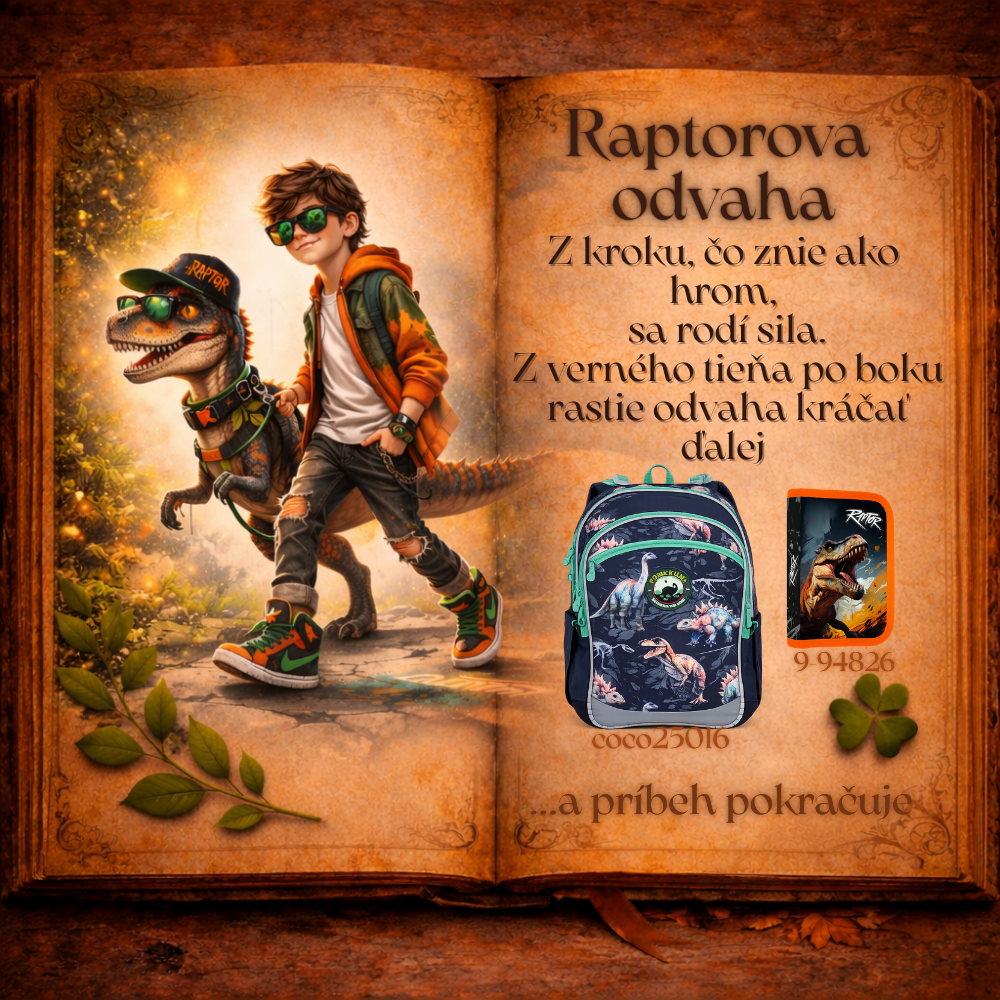 Niektoré školské sety sú praktické. Iné sú pekné. A potom existujú také, ktoré dokážu prebudiť fantáziu, odvahu a detskú radosť z objavovania. Raptorova odvaha patrí práve medzi ne. Je to školský set pre chlapcov, ktorí milujú dobrodružstvá, dinosaury a svet, v ktorom sa každý deň môže začať nová výprava za poznaním. Batoh, peračník aj doplnky spolu vytvárajú výbavu, ktorá je pripravená zvládnuť všetky školské výzvy prvého stupňa základnej školy – od prvých písmen až po veľké objavy. Tak ako raptor v dávnych časoch symbolizoval silu, bystrosť a odvahu, aj tento školský set pripomína, že každý malý školák v sebe ukrýva objaviteľa. Objaviteľa, ktorý sa nebojí pýtať, skúšať nové veci a kráčať za svojimi snami. A možno práve tu, medzi zošitmi, ceruzkami a prvými veľkými školskými úspechmi, začína príbeh, ktorý bude raz stáť za to rozprávať. Pretože každý veľký objaviteľ mal kedysi batoh na pleciach a hlavu plnú otázok. A každé dobrodružstvo sa začína prvým krokom do školy. 🌋📚✨