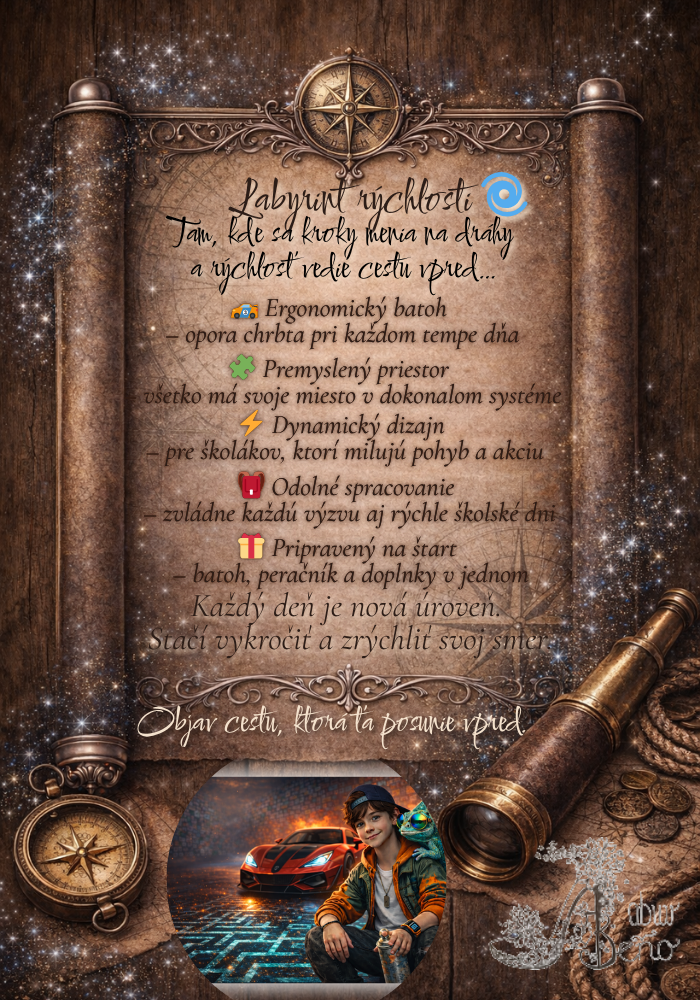 Predstavte si svet, kde sa rýchlosť myšlienok stretáva s dobrodružstvom objavovania. Školský set Labyrint rýchlosti nie je len obyčajnou výbavou do školy – je vstupenkou do sveta, kde sa každý nový deň mení na výpravu plnú nápadov, riešení a malých víťazstiev. Každá učebnica uložená v batohu je ako ďalšia brána v tajomnom bludisku poznania. Každý zápis v zošite je stopou na ceste k novým vedomostiam. A každý školský deň je dobrodružnou jazdou, v ktorej sa fantázia, odvaha a zvedavosť spájajú do jedného veľkého príbehu. Tento set je navrhnutý tak, aby bol spoľahlivým partnerom malého objaviteľa – od ranného vstupu do školy až po poslednú domácu úlohu večer. Spája praktickosť, odolnosť aj hravý dizajn, ktorý rozžiari každú školskú lavicu. Nech je každý krok v škole novou cestou, každá úloha novou výzvou a každý deň ďalším dobrodružstvom v nekonečnom labyrinte poznania. 🎒✨📚