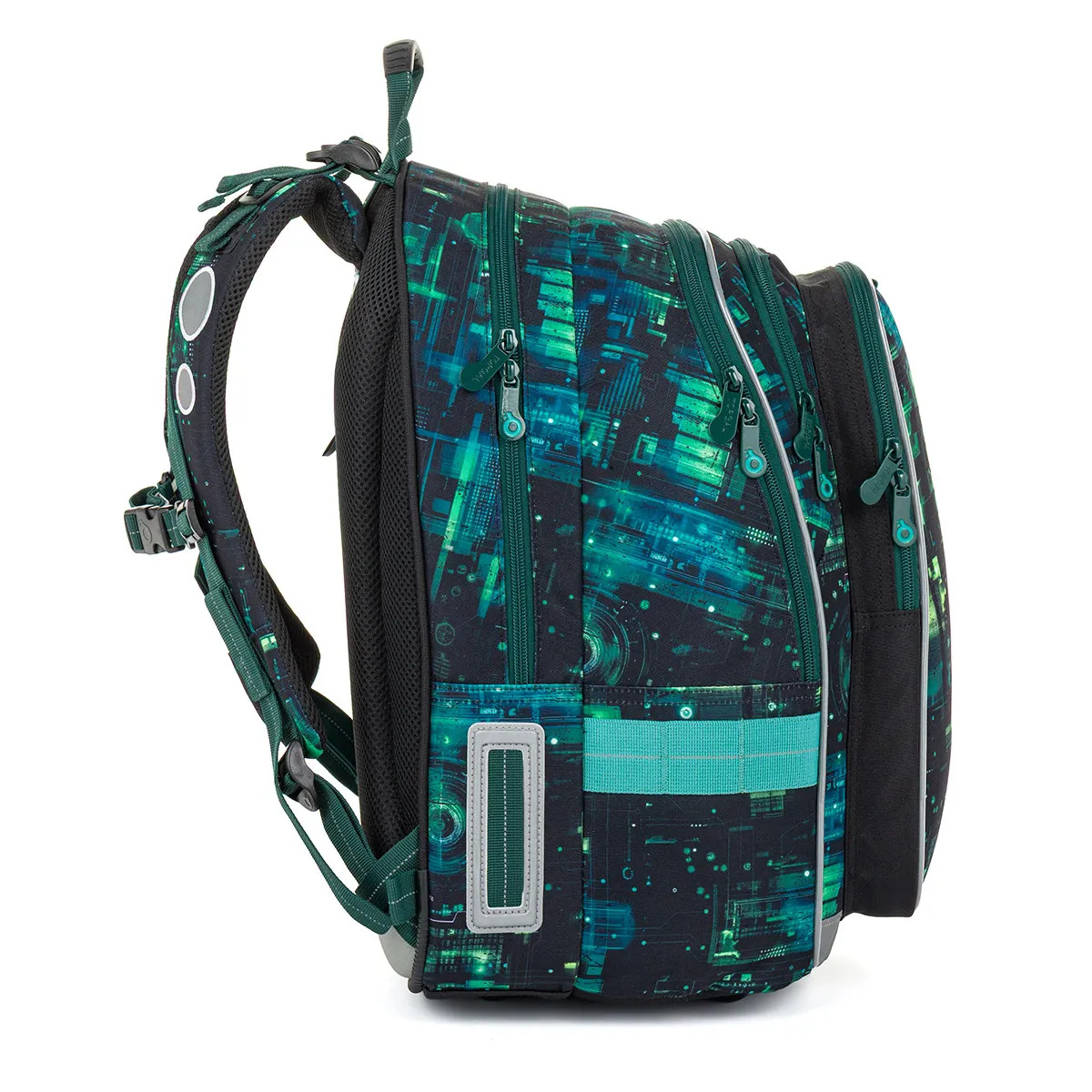 Predstavte si svet, kde sa línie digitálnych obvodov rozsvietia ako neónové cesty a každá myšlienka sa mení na nový objav. Školská taška LYNN z kolekcie Neónový impulz je presne takým spoločníkom – moderným a dynamickým batohom, ktorý sprevádza malých objaviteľov na ich každodennej výprave za vedomosťami. Jeho futuristický motív v zelených digitálnych tónoch pripomína pulz technologického sveta – svet počítačov, hier a nekonečných možností fantázie. Batoh je navrhnutý tak, aby spojil moderný dizajn s praktickosťou, ktorú školák potrebuje každý deň. Dve priestranné komory fungujú ako premyslený systém organizácie – podobne ako digitálna sieť, kde má každý prvok svoje presné miesto. Zadná komora bezpečne uloží najťažšie učebnice alebo dosky na zošity, zatiaľ čo predná komora poskytuje priestor pre peračník, box na desiatu či ďalšie školské drobnosti. V prednom vrecku nechýba ani praktická karabína na kľúče – malý detail, ktorý pomáha udržať poriadok. Anatomicky tvarovaný chrbtový systém a mäkko polstrované ramenné popruhy sa prispôsobia postave dieťaťa a zabezpečia pohodlné nosenie počas celého školského dňa. Výškovo nastaviteľná hrudná pracka pomáha udržať batoh stabilne na chrbte, aj keď sa malý objaviteľ ponáhľa za ďalším dobrodružstvom. Bočné vrecká pojmú fľašu s objemom 0,5 litra a reflexné prvky na prednej časti, bokoch aj popruhoch zabezpečia lepšiu viditeľnosť v šere či tme. Spodná časť batohu je vyrobená z odolného materiálu TOPDURA, ktorý chráni batoh pred odermi a pomáha mu zachovať pevný tvar aj pri každodennom používaní. Spolu s peračníkom a ďalšími doplnkami vytvára tento set dokonale zladenú kombináciu – akoby bol súčasťou jedného digitálneho systému pripraveného na nové úlohy, nápady a objavy. Každý školský deň sa tak mení na ďalšiu úroveň dobrodružnej hry plnej fantázie, tvorivosti a poznania. 🎒✨
