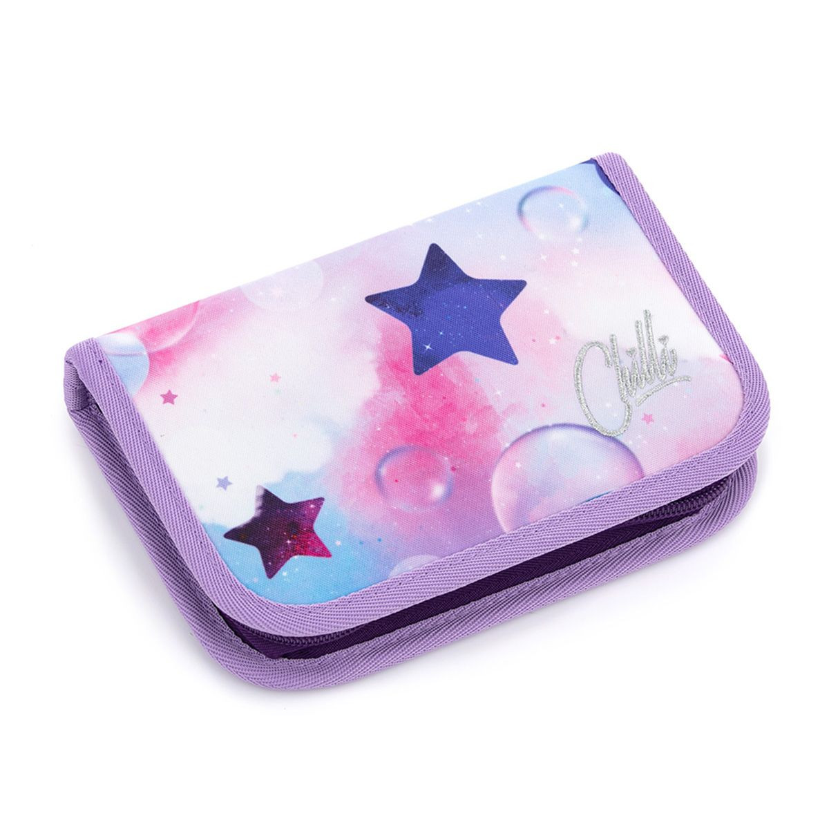 Peračník je ako malý kozmos plný tvorivosti. Jeho povrch zdobia hviezdičky, ktoré akoby sa vznášali nad ružovo-fialovým horizontom, a vnútri ukrýva svet pastelových fixiek, pier a ceruziek – každé písmeno, ktoré napíšeš, bude hviezdnym odkazom. 🪄✍️