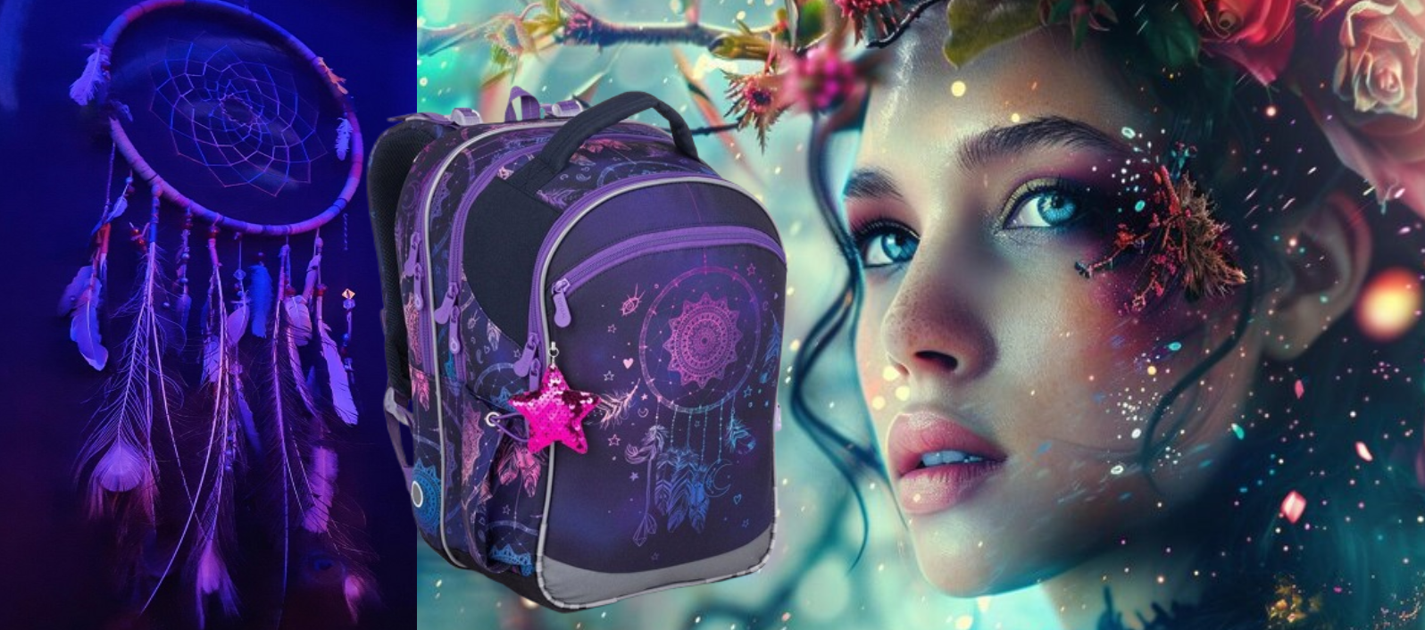 Tmavofialový trojkomorový batoh, zdobený magickým lapačom snov, je stvorený pre mladé dámy vyššie ako 120 cm. Celkový čarovný vzhľad korunuje ligotavý prívesok v tvare hviezdy, ktorý žiari ako ich sny ukryté za zipsom.