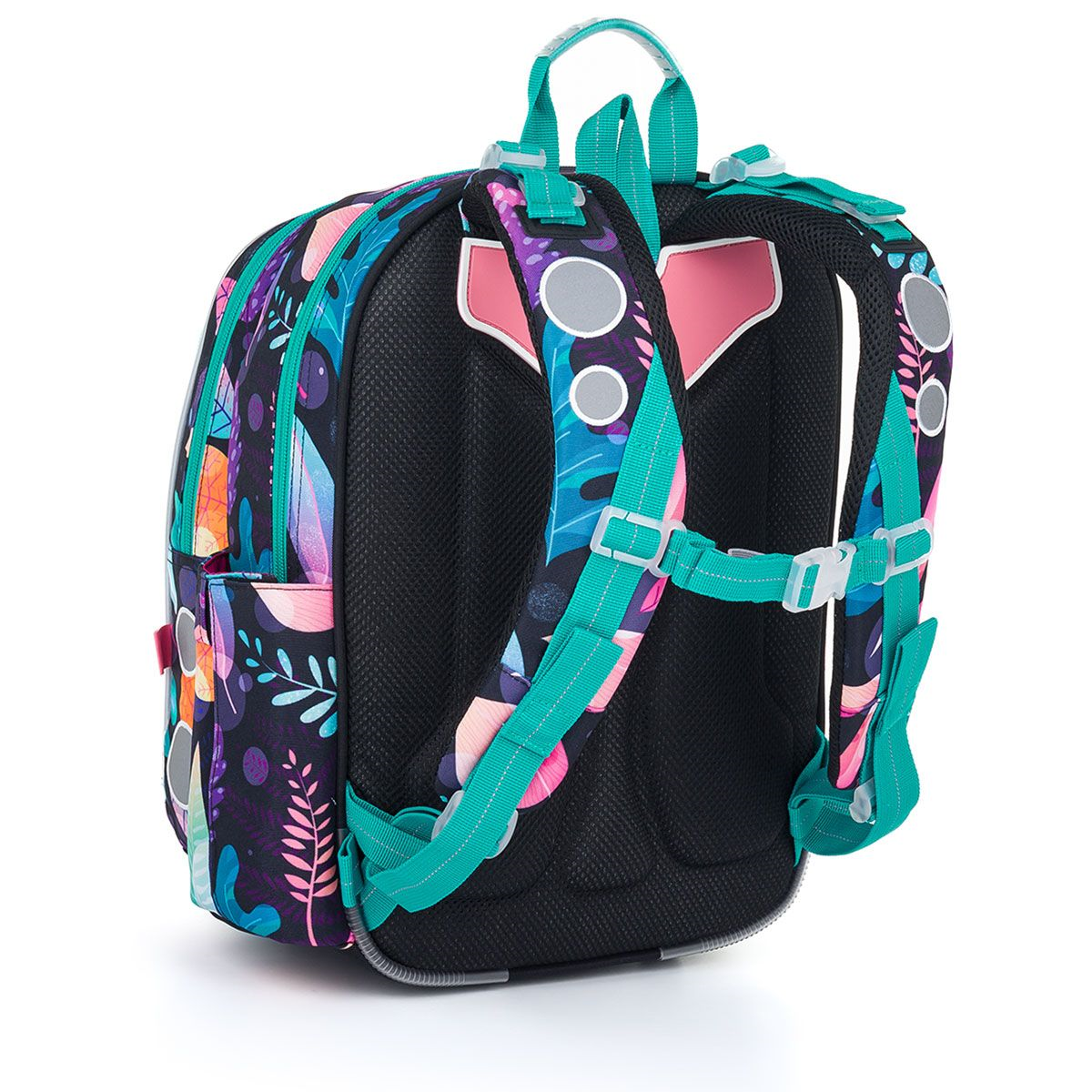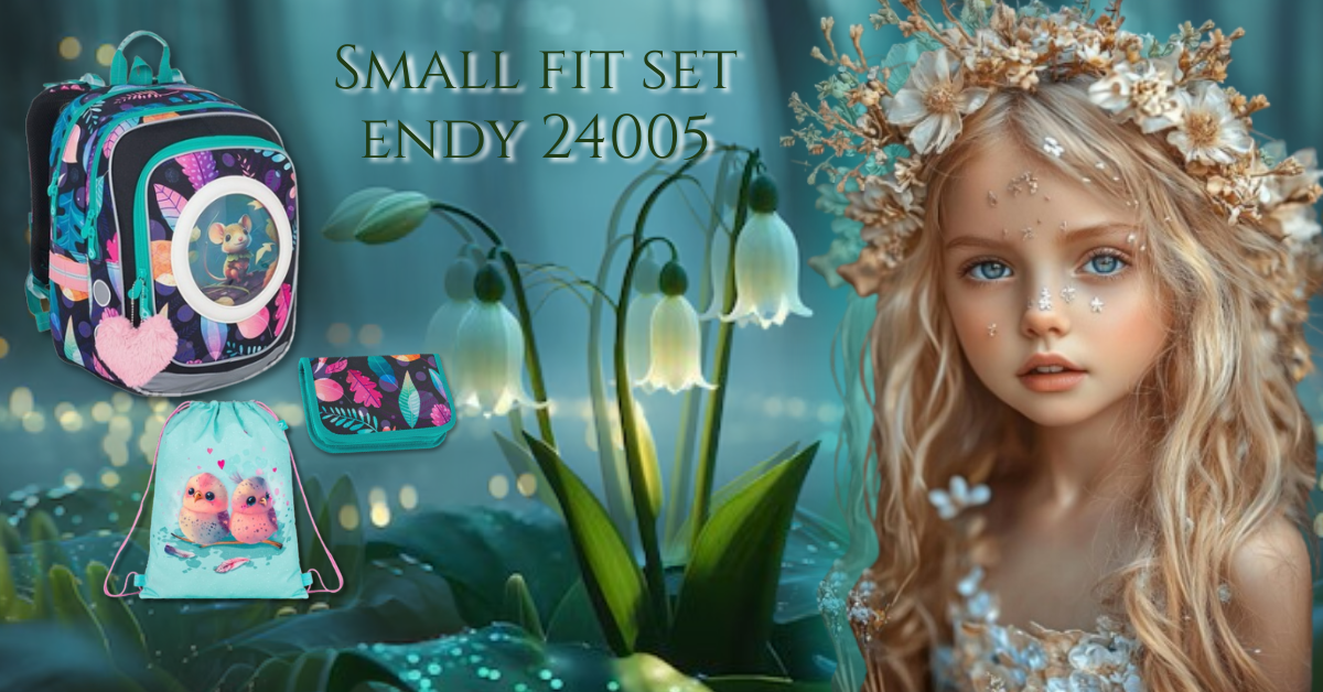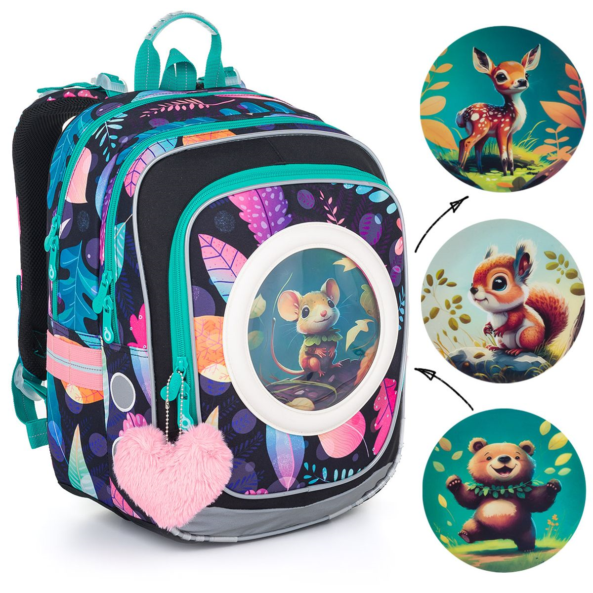 Batoh v tomto sete je ako brána do sveta, kde sa fantázia mieša s realitou. Tyrkysové a ružové odtiene sa prepletajú ako svetlo a tieň v zasneženom lese. 🦊 Lesný kamarát v okrúhlom okienku pôsobí ako malý sprievodca, ktorý ju bude každý deň sprevádzať chodbičkami školy.