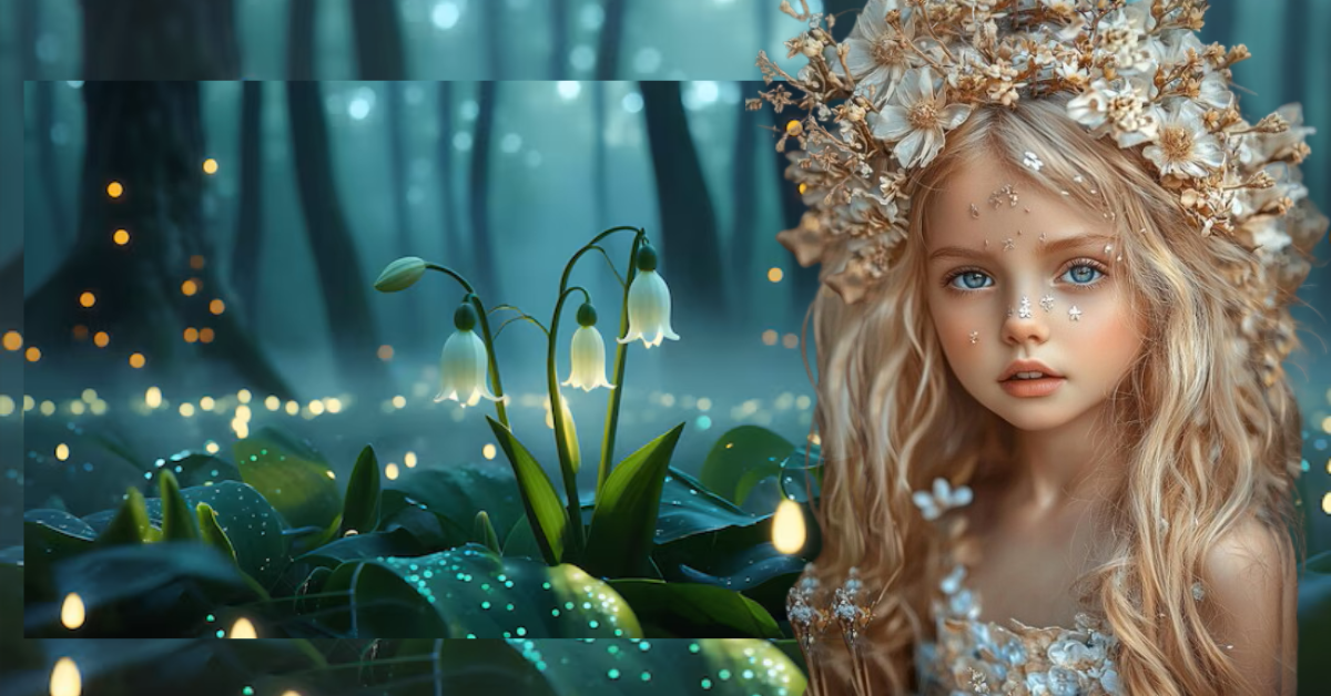 Dievčatko na obrázku stojí ako malá lesná víla, jej zlatisté vlasy prepletené bielymi kvietkami pripomínajú ranný mráz na lúčnom kvete. Jej pohľad je hlboký a čistý – akoby práve počula šepot snežienok, ktoré jej hovoria, že každý deň prináša nový začiatok. ✨🤍