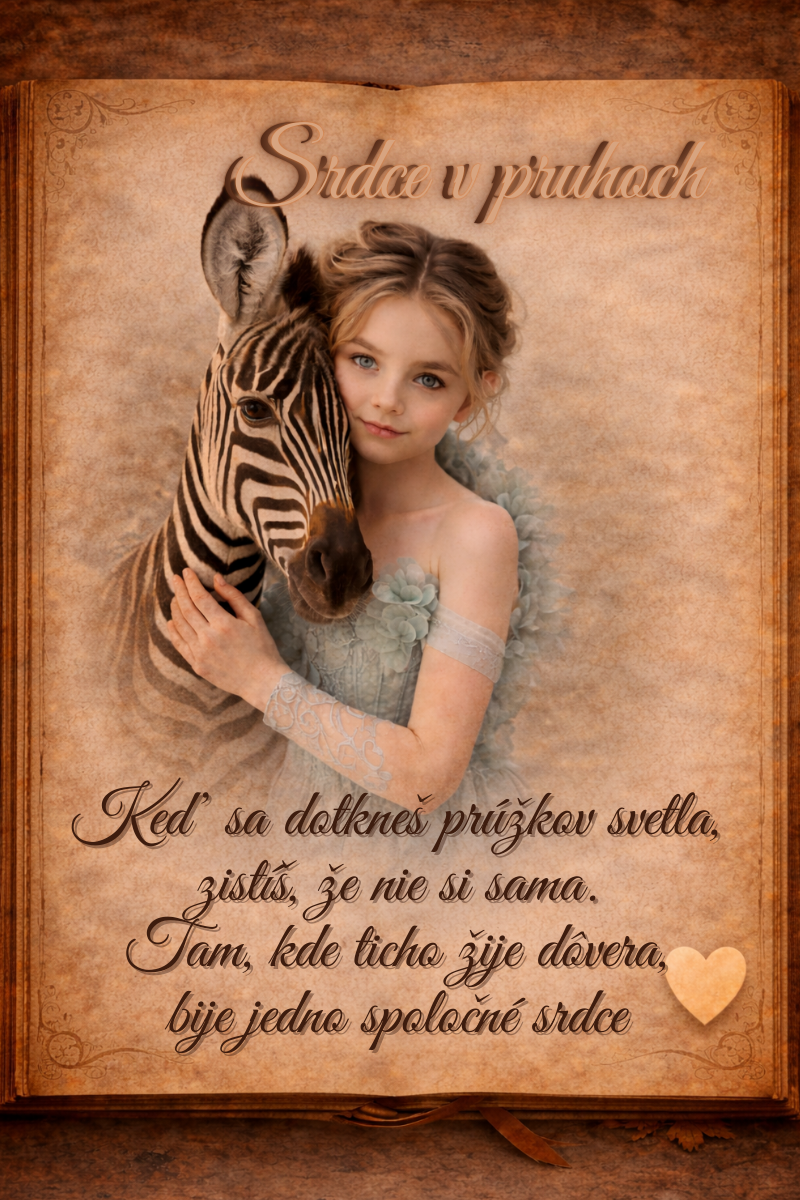 V očiach dievčatka sa odráža dôvera – tichá, hlboká, nežná. A v prúžkoch zebry pulzuje rytmus srdca, ktoré sa nebojí byť iné. Spolu vytvárajú svet, kde sa strach rozplýva ako ranná hmla a každý krok vedie k objavovaniu.