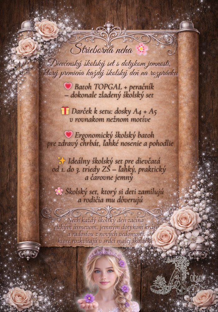 Nie všetko, čo žiari, musí byť hlasné. Niekedy stačí jemný odlesk, tichý úsmev a pohľad plný snov. Tento školský set je ako strieborný lúč ranného svetla – nežný, čistý a pokojný, no pritom plný vnútornej sily.