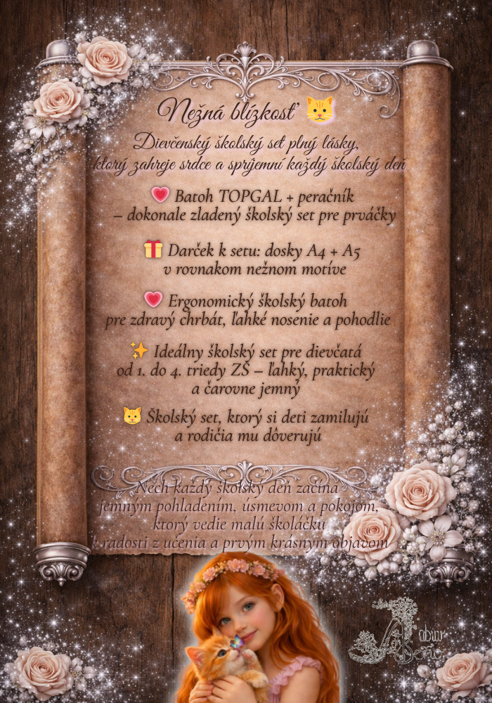 Je to set pre dievčatá, ktoré chcú objavovať svet citlivo, ale odvážne. A pre rodičov, ktorí vedia, že najdôležitejšie nie je len to, čo má dieťa v batohu – ale aj to, čo cíti v srdci, keď do školy kráča.