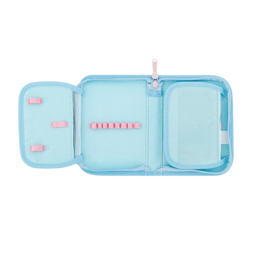 Vnútorné chlopne zdobia priehľadné fólie, pripravené ukryť rozvrh hodín — malú mapu školského dňa, ktorá pomáha udržiavať poriadok a prehľad v každodenných povinnostiach. Tento peračník tak spája praktickosť s jemnou eleganciou a stáva sa nenápadným, no vzácnym sprievodcom každej malej školačky.