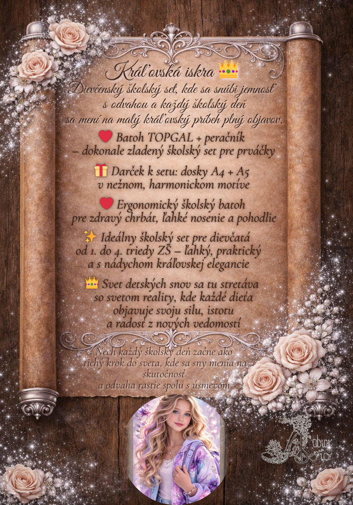 Kráľovská iskra tak nie je iba názvom. Je to atmosféra, ktorú tento set vyžaruje. Je to jemný lesk sebavedomia, neha ukrytá v pastelových tónoch, ladnosť prvých školských rokov a noblesa, ktorá nepotrebuje kričať, aby zanechala dojem. Tento set je stvorený pre dievčatko, ktoré chce vstupovať do triedy s pocitom výnimočnosti, s ľahkosťou v kroku a s krásnym pocitom, že aj školské povinnosti môžu mať podobu malého rozprávkového dobrodružstva. 👑✨