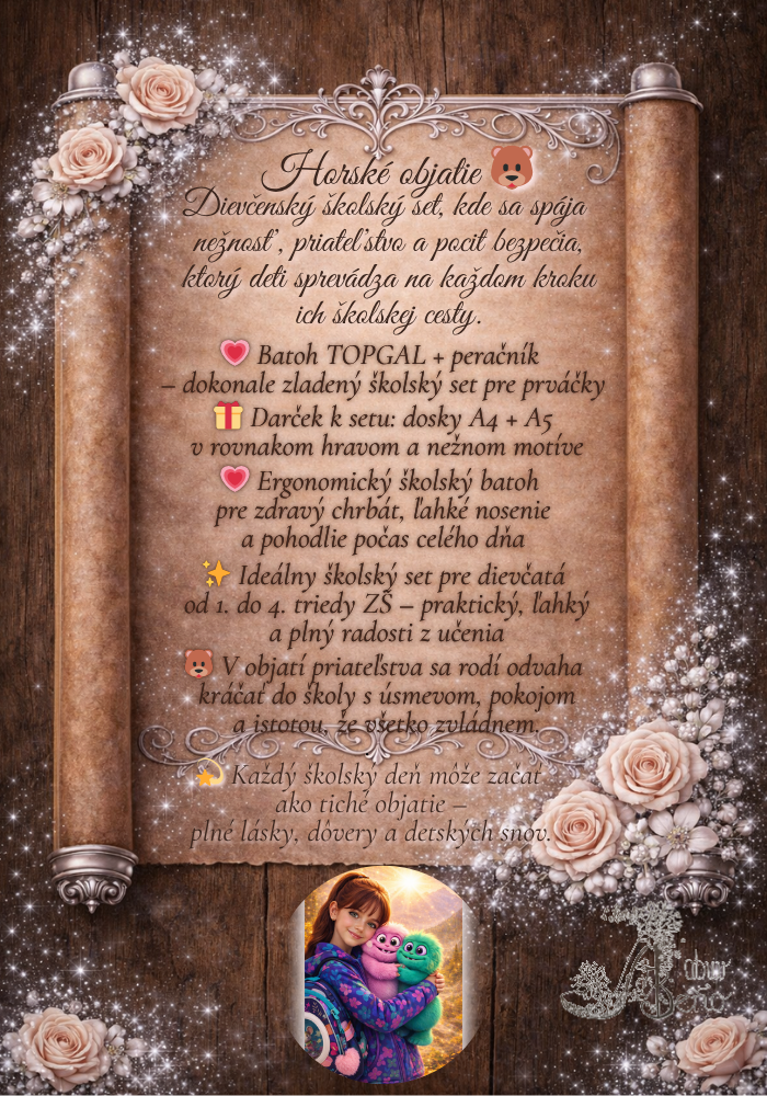 Sú rána, ktoré voňajú slobodou, čistotou a pokojom. Práve taký je aj tento čarovný školský set – jemný ako horský vánok, nežný ako prvé slnečné lúče padajúce na lúky a hrejivý ako objatie, ktoré dodáva istotu pri každom novom kroku. Horské objatie v sebe nesie kúzlo prírody, pokoj vysokých kopcov aj tichú krásu detských snov, ktoré sa každý deň menia na nové dobrodružstvá.