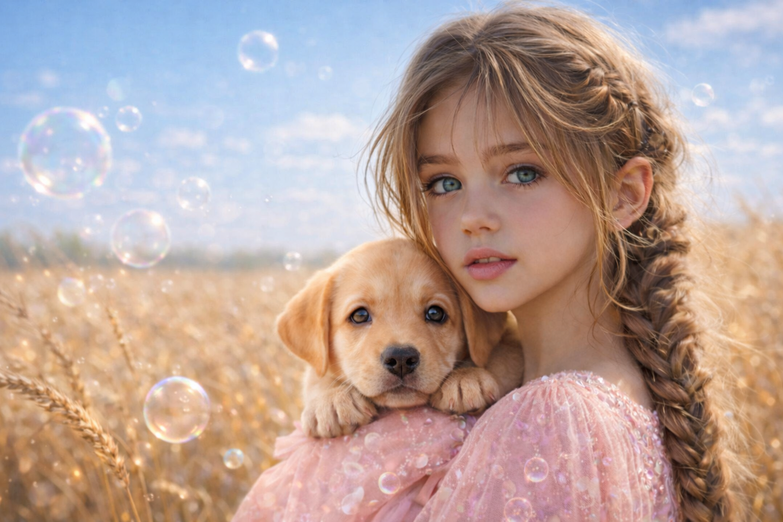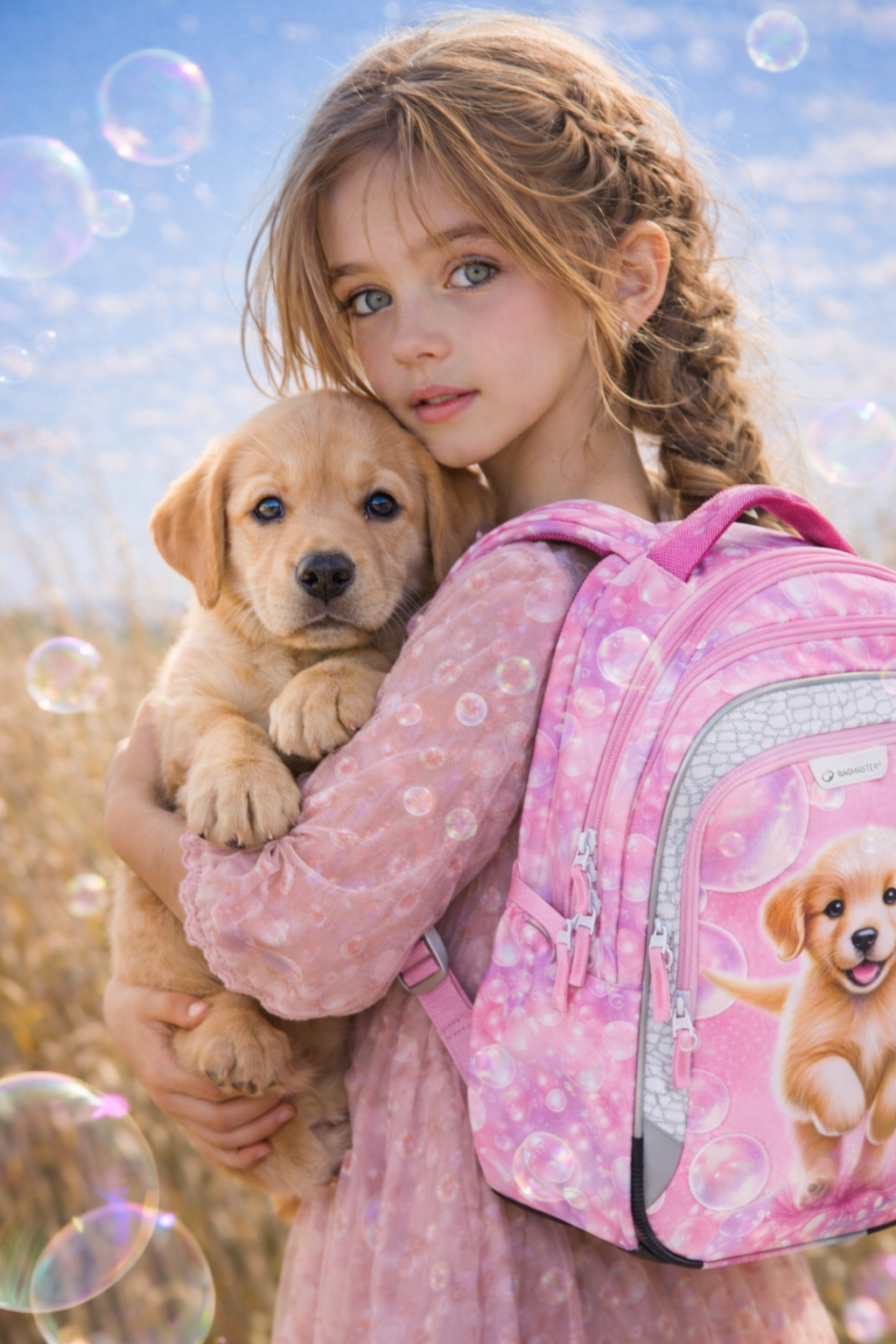 Na obrázku sa stretáva detská neha s vernosťou psieho srdca. Jemné objatie šteniatka a ružový batoh na chrbte vytvárajú okamih plný pokoja, kde každý krok do školy znamená nové dobrodružstvo 🐶🎒